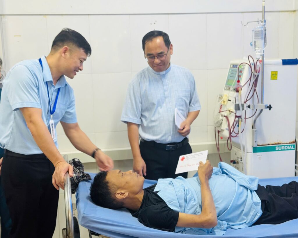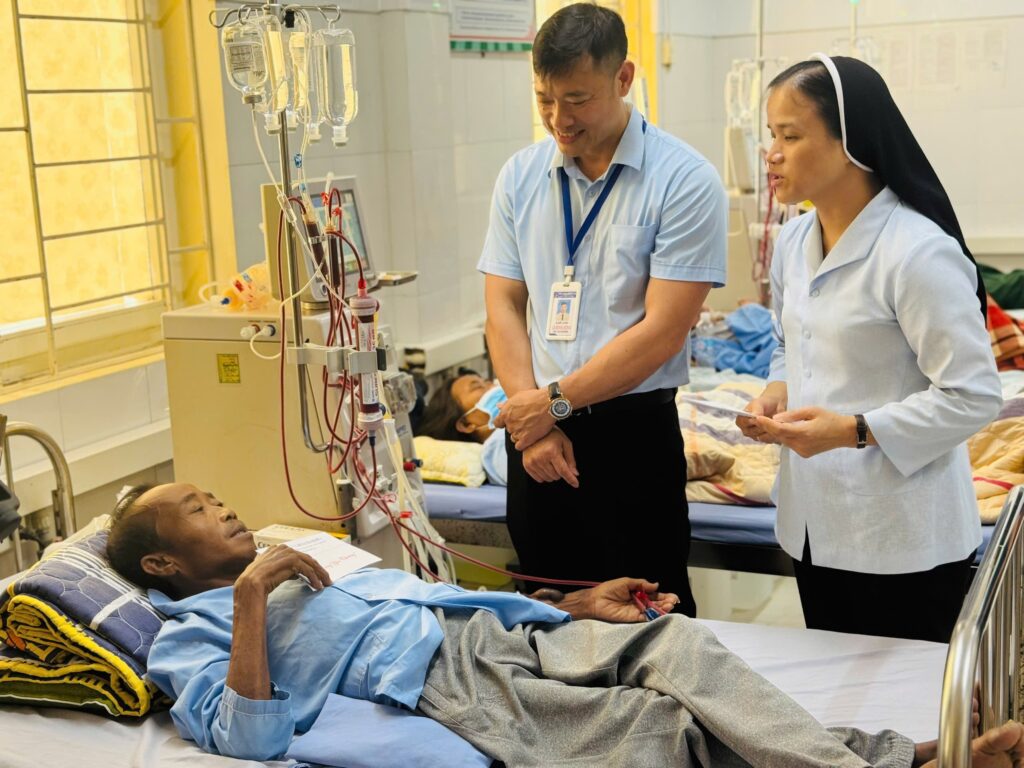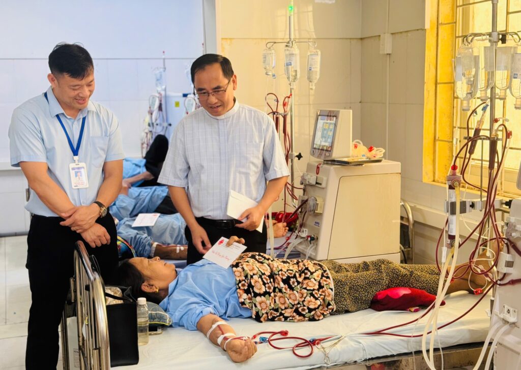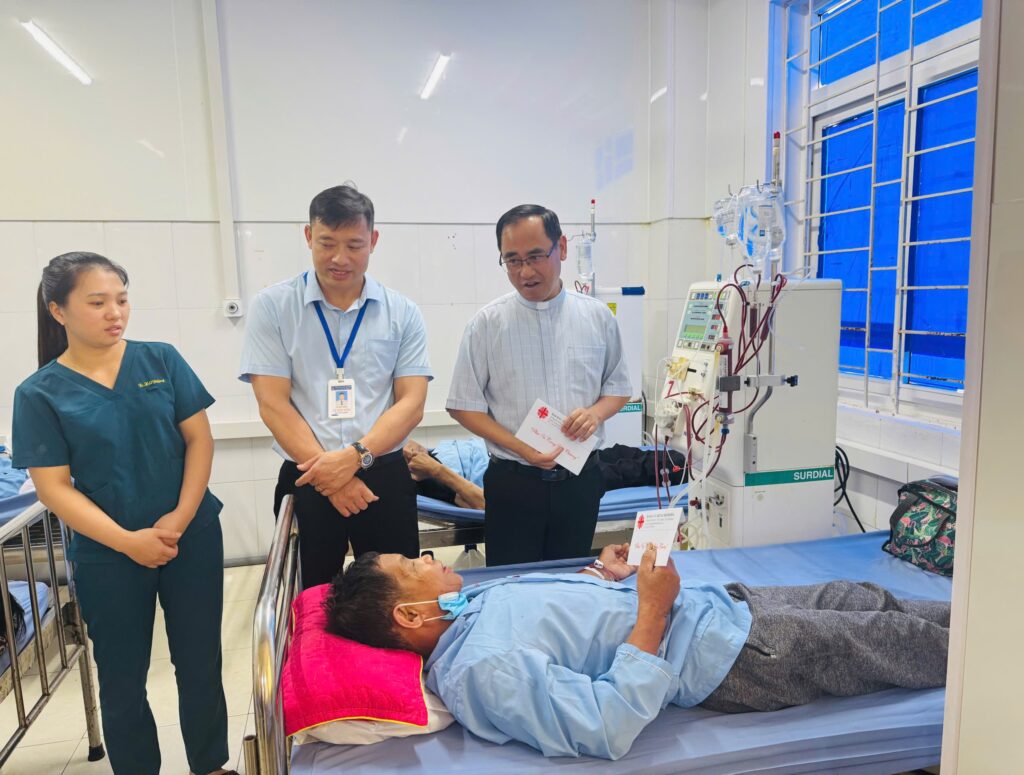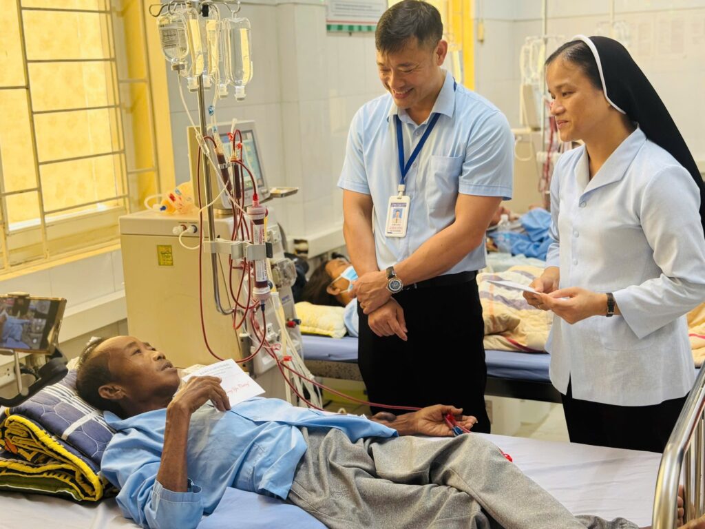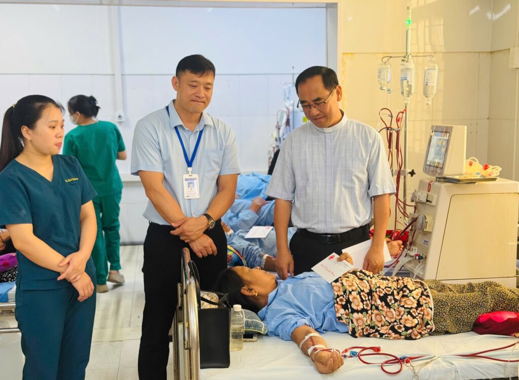 Trong không gian nồng mùi bệnh viện tại đơn vị lọc máu Bệnh viện Đa khoa Nông Cống, một buổi gặp gỡ đầy xúc động đã diễn ra. Caritas Thanh Hóa đã thay mặt hai vị ân nhân thầm lặng từ Seattle (Mỹ) trao tận tay mỗi bệnh nhân món quà 500 ngàn đồng tiền mặt.