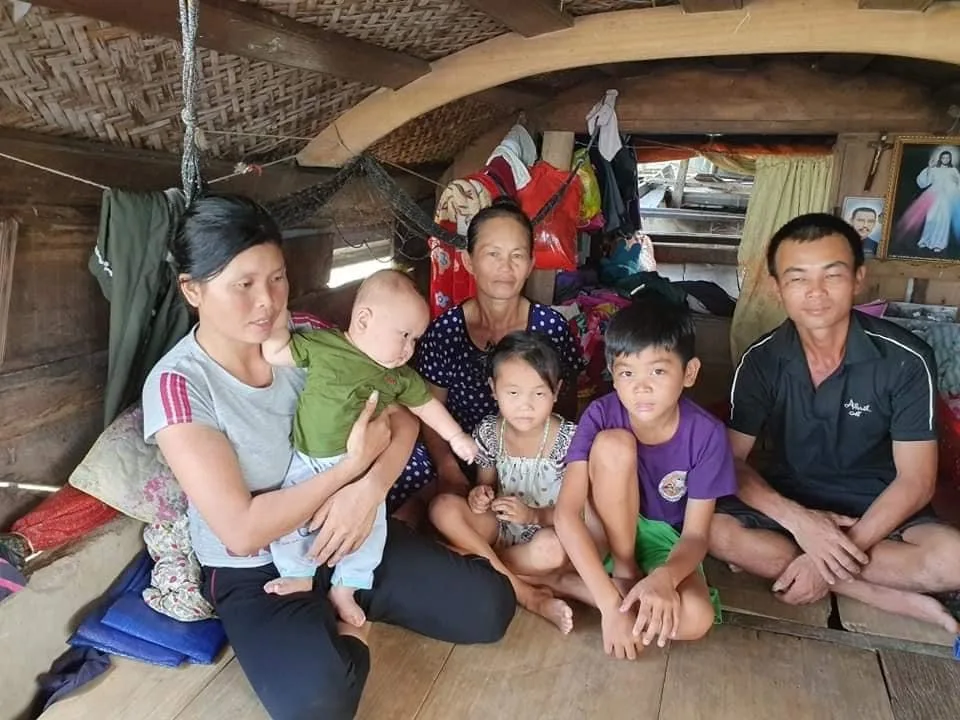 Khua nhẹ mái chèo trên dòng sông mênh mang sóng nước, chị Liên đưa đoàn chúng tôi đến thăm nơi ở của gia đình mình. Nhìn từ xa, đó là một con thuyền được lợp bằng những tấm tôn cũ, che kín mái thuyền, xung quanh quây những tấm bạt lớn để che nắng che mưa. Bên trong chiếc thuyền lụp xụp, một không gian chật hẹp, chỉ rộng vỏn vẹn vài mét vuông nhưng đó lại là nơi diễn ra mọi sinh hoạt của gia đình gồm 6 người.